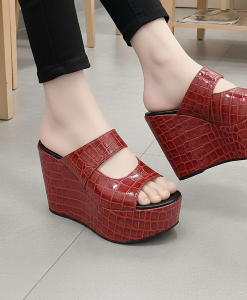 Chunky open toe high wedge shiny slip ons 3019